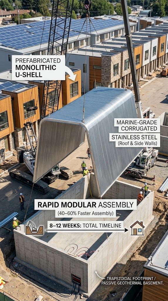 The system utilizes a prefabricated, monolithic inverted-U shell made of marine-grade corrugated stainless steel.